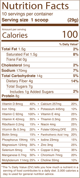 Organic Nonfat Milk, Acacia, Milk Protein Isolate, Alkalized Cocoa, Organic Flavors, MCT Oil, Vitamins and Minerals Blend (Maltodextrin, Vitamin C (as Ascorbic Acid), Magnesium (as Magnesium Phosphate), Choline (as Choline Bitartrate), Iron (as Ferric Pyrophosphate), Niacin (as Niacinamide), Vitamin E (as DL-Alpha Tocopheryl Acetate), Zinc (as Zinc Citrate), Pantothenic Acid (as D-Calcium Pantothenate), Manganese (as Manganese Sulfate), Pyridoxine (as Pyridoxine Hydrochloride), Thiamin (as Thiamin Hydrochloride), Riboflavin, Copper (as Copper Gluconate), Folic Acid, Vitamin K (as Phytonadione), Iodine (as Potassium Iodide), Molybdenum (Sodium Molybdate), Vitamin D (as Cholecalciferol), Chromium (Chromium Chloride), Selenium (Sodium Selenite), Biotin), Cane Sugar, Organic Vegetable Blend (Organic Broccoli, Organic Alfalfa Grass, Organic Kale, Organic Spinach, Organic Spirulina, Organic Wheat Grass), Sea Salt, Potassium Salt, Fermented Cane Sugar (Reb-M), Monk Fruit Extract.