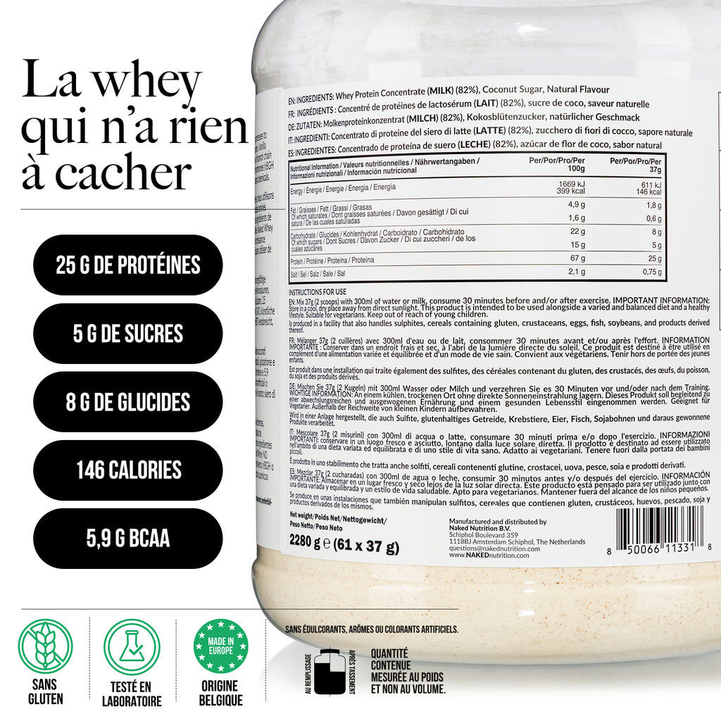 Naked Whey Vanille est idéal pour les personnes non sensibles au lactose et souhaitant augmenter leur apport quotidien en protéines. Que votre objectif soit de prendre du muscle ou de perdre du poids, Naked Whey Vanille fournit les nutriments nécessaires pour soutenir votre santé et vous aider à atteindre vos objectifs.