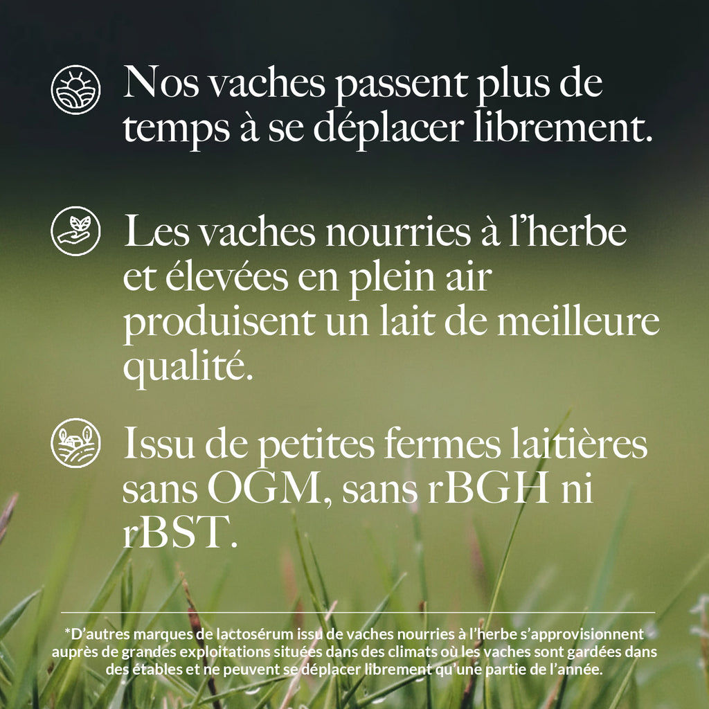 Naked Whey provient de vaches nourries à l'herbe, élevées dans de petites fermes laitières sans OGM. Nos vaches passent plus de jours en liberté, ce qui se traduit par un lait de meilleure qualité. Non seulement le lactosérum nourri à l'herbe est meilleur pour les animaux et l'environnement, mais il présente également plusieurs avantages pour votre santé.